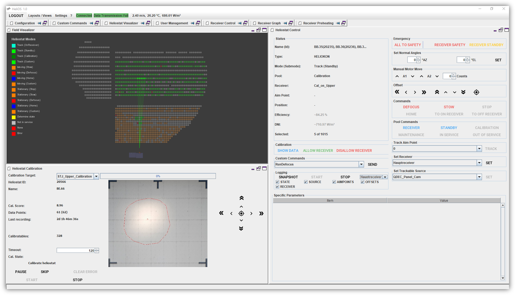 Equipment available range from 1 up to 2.000 heliostats. The HeliOS control system allows real-time, high-precision control of each heliostat, ensuring the accurate concentration and distribution of solar radiation. This system supports diverse configurations, from focusing sunlight on a small target area to distributing it across multiple test beds. Optical and infrared cameras are installed for experiment supervision.