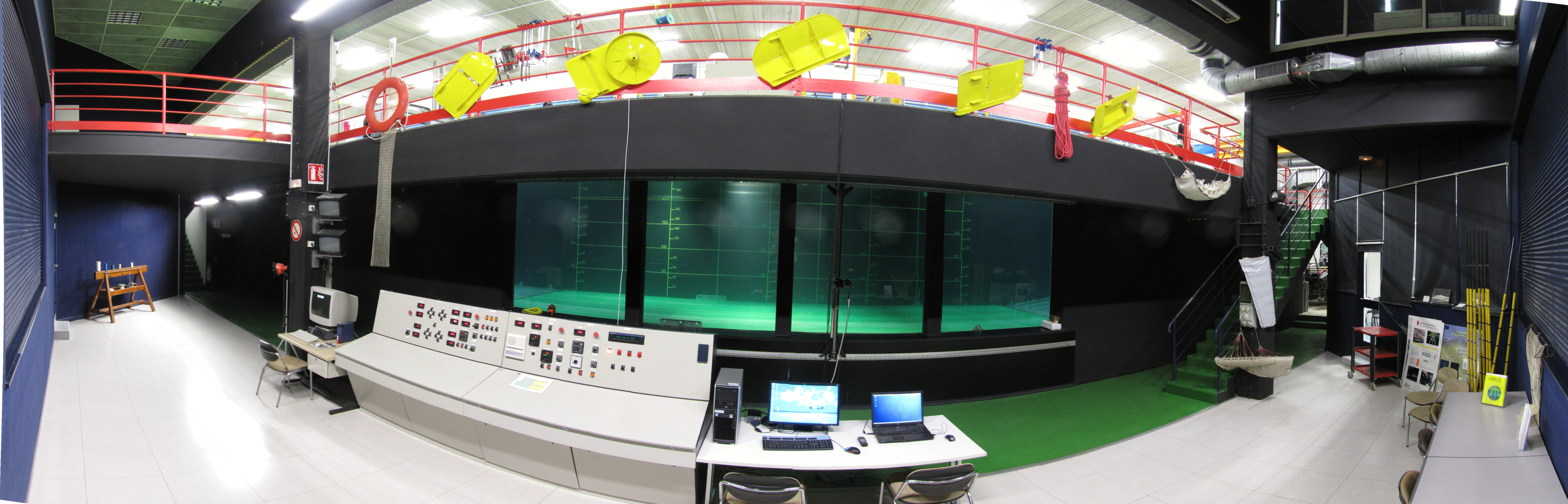 The tank is 18m long, 4m wide and 2m deep with a flow velocity up to 2m/s. The vertical velocity profile can be adjusted by means of specific grids/honeycomb assemblies and the orientation regulated by the use of a dynamic rotating instrumented platform. The bottom floor is instrumented and lift-able to the surface in order to facilitate and optimise the model installation and adjustment during tests.