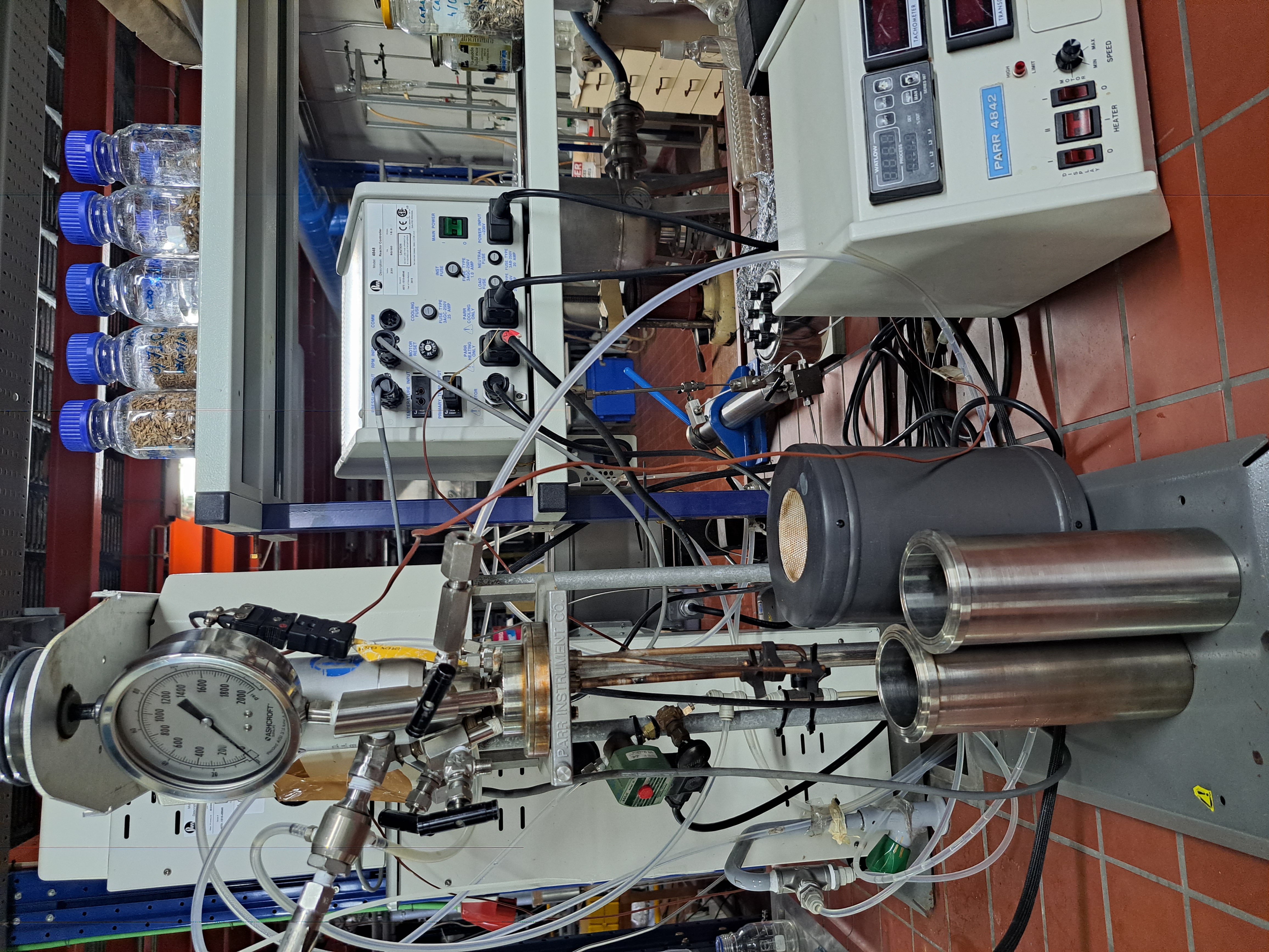 The biomass deconstruction/fractionation installation has several stainless-steel lab-scale stirred batch reactors - 160 mL (max. 200 bar, 350°C), 250 mL (max. 300 bar, 500°C), 600 mL (max. 125 bar, 350°C) and 2 L (max 125 bar, 350°C) - heated by external fabric mantles/heaters; and with precise PID temperature and agitation control. A continuous extruder-type reactor (1 kg/h, 250 ºC, and 50 bar) is also available. This installation can carry out all types of fractionation processes, including, hydrothermal, dilute acid, organosolv, alkali, CO2, ionic liquids, inorganic salts, and solid super acids-assisted processes. A 50 L direct steam stainless steel batch reactor is also available for biomass pre-treatment. Lab and pilot scale extraction reactors are also available from 1 L to 500 L.