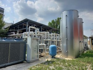 • Cooling circuit complete with circulation pump, heat exchangers, regulation valves and a chiller with 207 kWth cooling capacity used as a low-temperature source for the network components